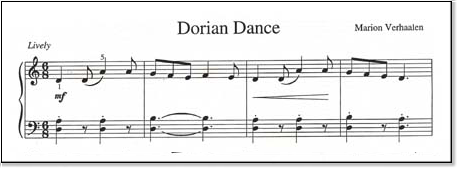 DORIAN DANCE lets the student concentrate on developing good tone and speed because of the simple texture and A A' B A' design. Both the lower and upper portions of the Dorian Mode on D are used. (MV)